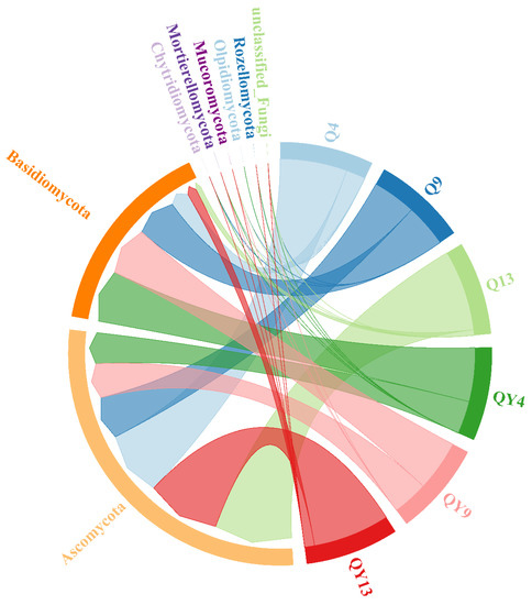 The distribution of fungi at the phylum level on the surface of outdoor bamboo is shown in Figure 5. The most significant feature was the massive colonization of bamboo by Basidiomycota and Ascomycota. Among the roofed groups, the relative abundance of Basidiomycota was 22.33%, 49.71%, and 6.51% in the Q4, Q9, and Q13 groups, respectively. In the unroofed groups, the relative abundance of Basidiomycota was 62.19%, 58.69%, and 11.47% in the QY4, QY9, and QY13 groups, respectively. Ascomycota was another dominant phylum in the fungal communities comprising 77.43%, 50.22%, and 93.35% in the Q4, Q9, and Q13 groups, respectively. Whereas the relative abundance of Ascomycota in the unroofed groups was 37.63%, 41.46%, and 88.04%, respectively. When comparing samples collected at the same time (Q4 vs. QY4, Q9 vs. QY9, Q13 vs. QY13), the relative abundance of Basidiomycota in the roofed groups was lower compared to that of the unroofed groups. On the contrary, the relative abundance of Ascomycota in the roofed groups was higher than that of the unroofed groups during the corresponding period of sample collection. Considering that the main difference between the roofed and unroofed samples was continuous precipitation, we speculated that rainfall was able to increase the relative abundance of Basidiomycota but decrease that of Ascomycota. This result was consistent with the previous study by Zhao et al. (2018), who found that water addition increased the relative abundance of Basidiomycota and decreased that of Ascomycota in the soil microbial community composition [52]. Niu et al. (2021) also found that the proportion of Ascomycota was higher on non-rainy days than on rainy days, whereas the percentage of Basidiomycota was much lower on non-rainy days than on rainy days [49]. Ascomycetes and Basidiomycetes were the most abundant groups in the soil fungal community [53]. Generally, Ascomycota mainly contributes to the early stages of lignocellulose degradation, and Basidiomycota mainly contributes to the late stages of lignocellulose degradation [54]. However, we found that the relative abundance of Basidiomycota in the unroofed groups reached its highest level at week_4 and showed a declining trend during the deterioration process. It has been reported that wood-decay basidiomycetes prefer an acidic condition, whereas ascomycetes prefer slightly alkaline environments [55]. The XPS analysis of unroofed groups showed that C4, characterizing the organic acid, increased in week 4 and then declined gradually to the same value as the control. As for the roofed groups, C4 increased sharply at week 9 and then declined rapidly to a low value, which corresponded to the variation in the relative abundance of Basidiomycota (Figure S4). Therefore, we speculated that the acid micro-environment on the unroofed round bamboo surface could lead to a high relative abundance of Basidiomycota at the initial stage of deterioration. Other phyla, such as Chytridiomycota, Mortierellomycota, Olpidiomycota, and Rozel-lomycota, were also recognized on roofed or unroofed bamboo samples in low abundance. Chytridiomycota, also known as chytrids, is one of the earliest diverging fungal lineages [56] and is widely distributed in soil and aquatic environments [57]. Recent research has revealed that Chytridiomycota were also found in many extreme environments, such as the desert [58], polar regions [59], and hydrothermal vents [60]. Chytridiomycota is able to penetrate some resistant structures and digest pollen, cellulose, chitin, and keratin to dissolved organic matter and dissolved inorganic matter [61], which play pivotal roles in the decomposition of particulate organic matter (POM) [62]. The phylum Mortierellomycota was proposed by Leho [63] based on phylogenies and divergence time. It has been reported that Mortierellomycota participates in the early stages of organic residue decomposition, releasing nutrients into the soil through the breakdown of plant residues [64] Olpidiomycota was introduced by Doweld [65] to accommodate Olpidiales, which was accepted in Chytridiomycetes [66]. There was only one class, one order, one family, and four genera in Olpidiomycota, and members of Olpidiomycota exhibited a wide range of life modes as saprobes and parasites [67]. Rozellomycota was located near the phylogenetic root of the Kingdom Fungi and existed ubiquitously from terrestrial to aquatic ecosystems [68]. All known members of Rozellomycota are obligate pathogens of various other eukaryotes, such as amoebae, algae, and other fungi [69]. It is well known that some minor taxa may play a critical role in the microbial community’s succession. However, the function of those minor taxa in round bamboo deterioration is still unknown and needs further investigation.