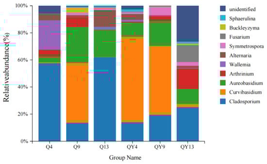 At the genus level, the dominant taxa found included representatives of the genera Cladosporium, Curvibasidium, Aureobasidium, Wallemia, Alternaria, Symmetrospora, Fusarium, Buckleyzyma, and Sphaerulina (Figure 6). Cladosporium dominated the deterioration process in both the roofed and unroofed groups, especially in Q4 (55.80%) and Q13 (58.76%). Cladosporium is one of the largest genera of the dematiaceous hyphomycetes fungus, and their adaptation to different environments allows them to have a broad lifestyle [64]. It is noted that Cladosporium spp. is also widely distributed in bamboo materials, e.g., decayed leaves [70], dead culms [71], and moso bamboo seeds [72]. Curvibasidium was the predominant fungal genus in Q9 (42.42%), QY4 (58.49%), and QY9 (48.56%), respectively. This genus was a yeast-like fungus and was proposed by Sampaio et al. (2004) to accommodate the sexual states of two yeasts of the Microbotryomycetes, C. cygneicollum Sampaio and Golubev and C. pallidicorallinum Sampaio and Golubev. The species of this genus Curvibasidium were widely distributed in various environments, such as marine sediments and white grapevine [73,74,75,76]. However, to our best knowledge, no research has reported on the colonization of Curvibasidium on bamboo. It has been reported that Curvibasidium pallidicorallinum is able to produce polygalacturonase, making it a candidate for enhancing the breakdown of berries’ cell walls during fermentation [77]. It is noteworthy that Wallemia showed a high relative abundance in Q4 (21.01%), while it almost disappeared in other groups. The genus Wallemia belongs to the order Wallemiales (Wallemiomycotina, Basidiomycota) and comprises the most xerotolerant, xerophilic, and also halophilic species worldwide [78]. Wallemia sebi is the most-studied species among the Wallemia, and it can grow in a relatively low water-activity (below 0.85) environment [79]. Similarly, W. muriae and W. ichthyophaga, another two species of Wallemia, have the obligatory demand for lowered active water (aw) in their habitats. Therefore, Wallemia spp. were found in various osmotically challenging environments, such as dry foods, salt crystals, and indoor and outdoor air [77]. Because of the continuous rainfall and increasing humidity, bamboo samples of QY4, QY9, QY13, Q9, and Q13 groups were supposed to have a higher water activity than that of Q4, making them unsuitable habitats for Wallemia.