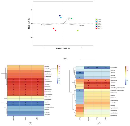 Figure 7. Relationship between fungal communities and environmental factors revealed by redundancy analysis (RDA) (a). Heat map of the correlation between fungal communities and environmental factors at the genus level of the roofed (b) and unroofed groups (c). The colors in the heat maps indicate the Spearman correlation coefficient r which ranges from −1 to 1; r < 0, negative correlation (blue); r > 0, positive correlation (red); Asterisks represent significance level: * p < 0.05, ** p < 0.01, and *** p < 0.001.