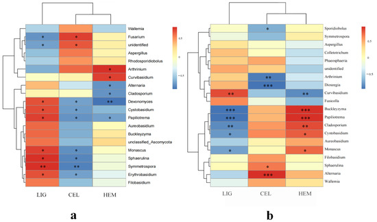 Figure 10. Heat map of the correlation between fungal communities and the relative content of lignin, cellulose, and hemicellulose at the genus level of the roofed (a) and unroofed groups (b) during the round bamboo deterioration process. The colors in the heat maps indicate the Spearman correlation coefficient r which ranges from −1 to 1; r < 0, negative correlation (blue); r > 0, positive correlation (red); Asterisks represent significance level: * p < 0.05, ** p < 0.01, and *** p < 0.001.