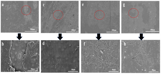 Figure 11. SEM images of control and roofed round bamboo samples during the deterioration process. (a,b) are the pictures of the control sample; (c,d) are the pictures of the sample from Q4 group; (e,f) are the pictures of the sample from Q9 group; (g,h) are the pictures of the sample from the Q13 group).