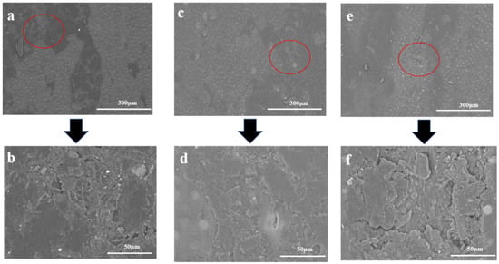 Figure 12. SEM images of unroofed bamboo samples during the round bamboo deterioration process. (a,b) are the pictures of sample from QY4 group; (c,d) are the pictures of sample from QY9 group; (e,f) are the pictures of sample from QY13 group).