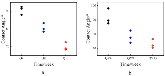 Figure 13. The contact angle of bamboo green during the round bamboo deterioration process. (a) Roofed groups; (b) Unroofed groups.