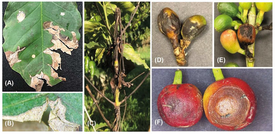 Anthracnose symptoms detected in the surveyed coffee plantations. Small lesions with irregular margins merging to develop large necrotic black patches starting from the leaf margins and moving to the middle of the leaf blade (A); close focus on the necrotic area showing the semi-immersed acervuli (B); dark necrotic patches result in the death of both the lateral and apical shoots (C); dark to brown sunken and depressed lesion on the green and red fruit berries (D–F).