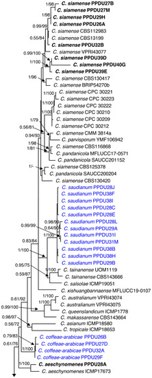 Notes: The C. gloeosporioides species complex is characterized by cylindrical conidia that have rounded ends and taper slightly towards the base, which is similar to the conidial morphology observed in C. coffeae-arabicae [8,25]. However, the multi-locus phylogenetic analysis revealed that the four C. coffeae-arabicae strains formed a discrete clade and were phylogenetically distinct from the current recognized species within the gloeosporioides complex. Furthermore, BLASTn search of the ex-type strain PPDU26B of C. coffeae-arabicae sequences revealed a variable sequence resemblance with other sequences within the NCBI GenBank from different species. The closest matches using the ITS had a 100% similarity to C. siamense (GenBank MT450691, MT450690, and MT450689). Furthermore, the closest ACT sequence match showed 100% similarity to C. aenigma (GenBank OQ698783 and OQ698782) and 100% to C. siamense (OQ698755). However, TUB2 showed the highest similarity 100% to C. siamense (GenBank OP660847; OP660836 and OP660829). However, the CHS-1 sequence revealed homology of 99.5% to C. gloeosporioides (GenBank MF554932 and ON723793) and 99% to C. fructicola (GenBank OQ703570). Moreover, the GAPDH sequences demonstrated 100% to C. siamense (GenBank MF110865; MN228537 and MN228536). Additionally, the ApMat sequences had 96.7% similarity with C. siamense (GenBank KX578771), 96.3 % with C. siamense (GenBank MW557490), and 96.1% with C. siamense (GenBank OM816816). The morphological comparisons and phylogenetic analyses ascribed C. coffeae-arabicae as a novel taxon within the C. gloeosporioides complex.