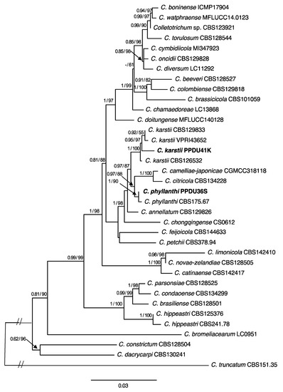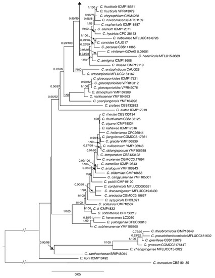- Liu, F.; Weir, B.S.; Damm, U.; Crous, P.W.; Wang, Y.; Liu, B.; Wang, M.; Zhang, M.; Cai, L. Unravelling Colletotrichum Species Associated with Camellia: Employing ApMat and GS Loci to Resolve Species in the C. gloeosporioides Complex. Pers. Mol. Phylogeny Evol. Fungi 2015, 35, 63–86. [Google Scholar] [CrossRef]