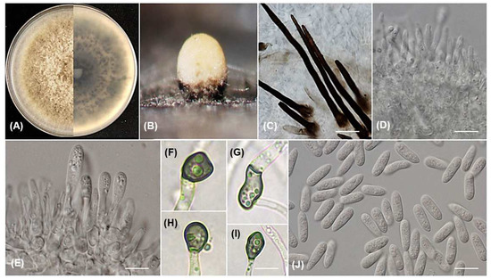 Colletotrichum saudianum (from ex-holotype strain PPDU38H). Colony morphology (A); pinkish orange masses of conidia releases from acervuli (B); hyaline conidiophores (C–E); appressoria (F–I); hyaline conidia (J). - Scale bars; (C–J) = 10 µm.