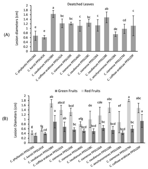 Lesions diameters (y-axis) released from 12 Colletotrichum isolates (x-axis) inoculated on detached coffee leaves (A), red and green fruit (B) after 10 days of incubation at 25 °C. Each isolate’s values represent the mean of six replicates ± (SD). Means designated with similar letters in these columns did not vary significantly according to the LSD test (p < 0.05).