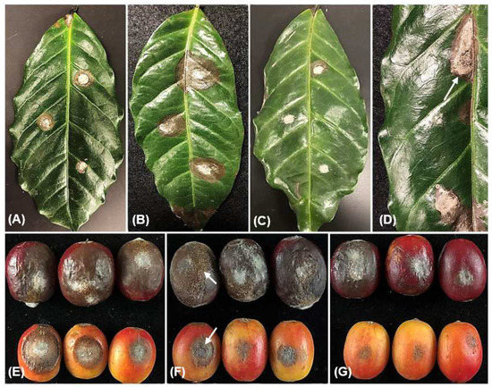 Symptoms reproduced by tested Colletotrichum species on detached coffee leaves (A–D); necrotic lesions developed on red and green fruits after 8 days of incubation at 25 °C (E,F); small lesions developed by the C. krastii PPDU41K showing the weakness of the fungus to reproduce the symptoms observed in the field (C,G); orange masses of conidia released from semi-immersed acervuli (arrows) observed on the necrotic tissues of leaves and red fruit produced by the virulent isolate of C. saudianum PPDU38H (D,F).
