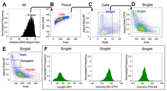 Gating strategy for profiling Candida albicans. Focused fungal cells were identified using gradient root mean square (RMS) method (A), then separated from aggregates and debris on the basis of area and side-scatter area (SSC-Ch06) (B). The remaining debris and aggregates were further filtered out based on width and area versus aspect ratio (C,D). Populations were then grouped by morphology and separated into three subpopulations, including yeast, germ tube-forming cells (i.e., elongated), and hyphae based on aspect ratio and area (E). Representative histographs of length, fluorochrome intensity of calcofluor white, and FM4™4-64 are shown (F). Other parameters such as cell area, circularity, and any meaningful features of the assays can also be created for the target subpopulations of the gated singlet cells.