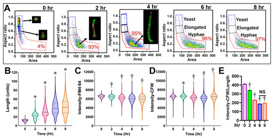 Profiling Candida albicans cells using imaging flow cytometry analysis. Candida cells were grown in RPMI-1640 medium at 37 °C with 5% CO2 for a period of 8 h and stained with calcofluor white (CFW) plus FM4-64 for FCP analysis. Gating strategy for focused and single cells is shown in Figure 1. Subpopulations of yeast, elongated cells (budding or germ tube-formatting), and hyphae in 0–8 h cultures were defined from gated single cell population by dotted plots using area versus aspect ratio (A). Representative images of each subpopulation are shown in the inserts. At 2 h after inoculation, 93 ± 2.2% of yeast grew into hyphae. Percentage of hypha subpopulation is indicated in each analysis panels. Data of IDEAS®-software-defined features for each sample (>4000 cells) were exported and analyzed for cell length (B), and fluorochrome intensity of FM4-64 (C) and CFW (D) using GraphPad (violin plots with median and quartile lines). Data for newly created feature (i.e., intensity of CFW/length) were also exported and plotted (E). * p < 0.05 and † p < 0.05 represent significant increase or decrease, respectively, between the corresponding feature at indicated time points and 0 h control samples, by one-way ANOVA test.