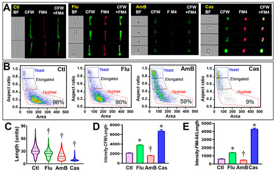 Cytological profiling of C. albicans following exposure to clinical antifungal drugs. Yeast grown in RPMI-1640 medium was treated with fluconazole (Flu), amphotericin B (AmB), and caspofungin (Cas) for 8 h, or left untreated as control (Ctl). Calcofluor white (CFW) and FM™4-64 (FM4) were then mixed to stain fungal cell wall and vacuolar membrane. At least 2000 focused images were analyzed for each sample. Representative images of treated and control (untreated) C. albicans cells are shown in (Panel (A)). The percentage of hyphal subpopulation under each treatment condition and control is indicated in each plot (B). Alteration of fungal growth by drug treatment was plotted with histogram of hyphae length (C). Alteration of cell wall integrity and membrane permeability by drug treatment was plotted as histograms of CFW and FM™4-64 binding intensity normalized with cell length (D,E). * and † indicate statistically significant increase and decrease between treatment and control groups, respectively (one-way ANOVA test, p < 0.01).