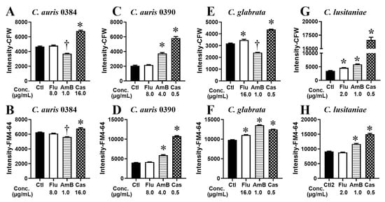 Cytological profiling of Candida spp. following exposure to clinical antifungal drugs. C. auris (0384 and 0390 strains), C. glabrata, and C. lusitaniae were treated with fluconazole (Flu), amphotericin B (AmB), and caspofungin (Cas) for 8 h, or left untreated as control (Ctl). Fluorochrome intensity of calcofluor white (A,C,E,G) and FM4-64 (B,D,F,H) for each Candida species was plotted for each drug treatment. The relative fluorescence intensities (median ± SEM) for each treatment group compared to control were graphed. * and † indicate statistically significant increase and decrease between treatment and control groups, respectively (one-way ANOVA test, p < 0.01).