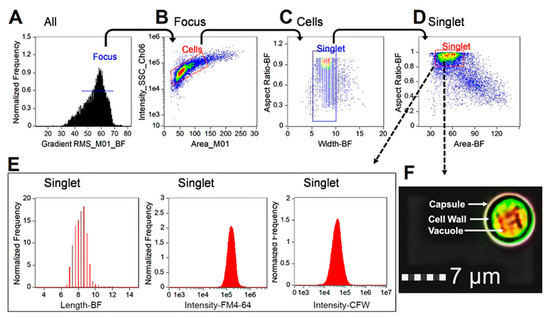 Gating strategy for Cryptococcus neoformans. Focused yeast (H99 strain) were identified by RMS (A). Yeast singlets were further selected by separation from aggregates and debris on the basis of two plots using area versus side scatter channel (SSC-Ch06) and width versus aspect ratio (B,C). Finally, the singlets were gated on the dotted plot using area versus aspect ratio (D). IDEAS®-software-defined or newly created features such as cell length and fluorochrome intensity of FM4-64 and CFW for each sample were analyzed and plotted (E). A typical H99 cell in the defined yeast singlet population was shown (F).