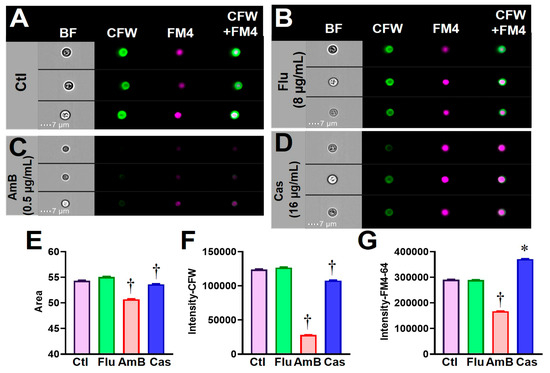 We further extended this FCP method to the C. neoformans H99 strain that was also cultured in the same buffered RPMI-1640 medium in the absence or presence of antifungal drugs. H99 yeast cells were stained with CFW and FM4-64FX and their images were acquired using the same acquisition program for Candida species. The gating strategy is illustrated in Figure 5. A set of feature parameters for the H99 yeasts were established for size, shape, texture, signal intensity, and any combined characteristics. These values for untreated H99 yeast did not change for the period of a 48 h incubation; therefore, all subsequent experiments were performed using the 48 h incubation condition. Images of H99 yeast cells after incubation in the presence of a sub-inhibitory concentration of Flu (8 µg/mL) were comparable to controls (Figure 6A,B). Notably, H99 FCPs were visibly altered after incubation with AmB and Cas at their MICs (0.5 and 16 µg/mL, respectively) (Figure 6C,D). Digitalized values of cell size (area) and fluorescence intensity of CFW were significantly reduced for AmB- and Cas-treated yeast compared to controls (Figure 6E,F). Fluorescence intensity of FM4-64FX was significantly reduced for AmB-treated yeast, while it was elevated for Cas-treated cells compared to control (Figure 6G). These data suggest that the FCP method is sensitive, quantitative, and objective for detecting cellular impact of antifungal drugs.