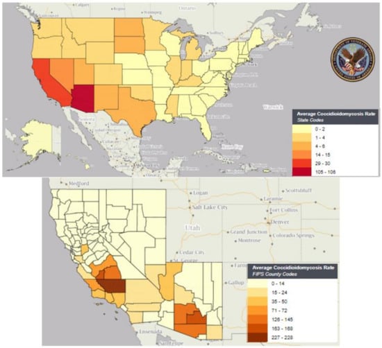 - McCotter, O.Z.; Benedict, K.; Engelthaler, D.M.; Komatsu, K.; Lucas, K.D.; Mohle-Boetani, J.C.; Oltean, H.; Vugia, D.; Chiller, T.M.; Cooksey, G.L.S.; et al. Update on the Epidemiology of coccidioidomycosis in the United States. Med. Mycol. 2019, 57 (Suppl. S1), S30–S40. [Google Scholar] [CrossRef] [PubMed]
