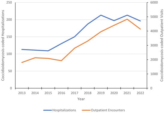 From 1 January 2013 to 31 January 2023, there were 31,642 coccidioidomycosis-coded outpatient encounters (including telehealth visits) among coccidioidomycosis-positive individuals, including 12,126 (38.3%) in infectious diseases, 7211 (22.8%) in primary care/medicine, 3797 (12%) in pulmonary, 803 (2.5%) in physical medicine and rehabilitation/physical therapy/occupational therapy/kinesiotherapy, 646 (2%) in rheumatology, and 312 (1%) were coccidioidomycosis-coded during emergency department/urgent care visits. Most coccidioidomycosis-coded outpatient visits occurred at VHA facilities in CA (12,890; 40.7%), AZ (10,621; 33.6%), TX (1535; 4.9%), NV (971; 3.1%), and NM (652; 2.1%). There was an average of 7.5 coccidioidomycosis-coded outpatient visits per coccidioidomycosis-positive patient. The annual number of coccidioidomycosis-coded hospitalizations and outpatient visits among test-positive individuals increased over the study period (Figure 2).