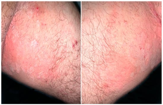 A 26-year-old healthy man from Afghanistan, living in Switzerland since December 2021 consulted for a pruritic extensive dermatosis that occurred two months before his arrival. Clinically, skin lesions presented as erythematous annular plaques of the groins and multiple excoriated papules localized over the trunk, legs and arms (Figure 4).