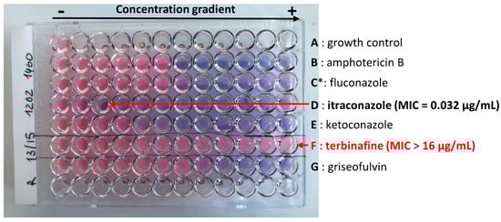 In vitro analysis of antifungal susceptibility was tested in a microplate with a colorimetric detection of fungal viability based on metabolic activity. Microplate wells contain six antifungal molecules (amphotericin B, fluconazole, itraconazole, ketoconazole, griseofulvin and terbinafine) at various concentrations; ranging from 256 mg/L to 0.12 mg/L for fluconazole and from 16 mg/L to 0.008 mg/L for the others five molecules. Custom SensititreTM microplates were prepared by Thermo Scientific (Thermo Fisher Scientific Inc., Waltham, MA, USA) for amphotericin B, fluconazole, itraconazole, ketoconazole. For terbinafine and griseofulvin serial two-fold dilutions were prepared in DMSO and added to the well containing the fungal suspension. MIC determination was performed according to the EUCAST method [] with minor modifications. Briefly, isolates were sub-cultured on Potato dextrose agar and incubated at 30 °C for 7 days. Harvested colonies were resuspended in 0.9% NaCl and 0.05% Tween 20. A microconidia suspension was prepared by filtration using filters with 11µm pore diameter and cell density adjusted to McFarland of 0.5. Two milliliters of the suspension were then diluted in 11 mL of Sensititre Yeast Susceptibility Inoculum Broth (Thermo Fischer Scientific Inc.) to obtain a theoretical final working solution of 4.105 to 1.106 CFU/mL. A hundred microliters were added to each well of the microplate. The viability and the counting of CFU were performed on Sabouraud dextrose agar according to EUCAST protocol. One hundred to 250 colonies were expected from an acceptable test suspension. A modification with the EUCAST method [] was the reading of the cell viability by Alamar blue which changed from blue to pink when growth was present. The MIC value was defined by visual inspection of color change after 4–5 days of incubation at 30 °C. The first well with a blue color corresponded to the minimum inhibitory concentration for a given molecule. An antifungal plate illustrating a resistant strain to terbinafine (>16mg/L) was presented in Figure 6.
