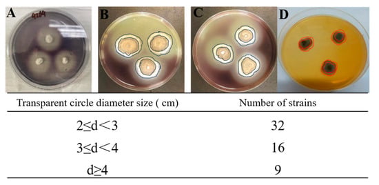 Examples of transparent circles produced by marine fungi with amylase activity, (A): fungi with no amylase activity; (B,C): fungi with amylase activity; (D): the use of Aspergillus fumigatus as a positive control.