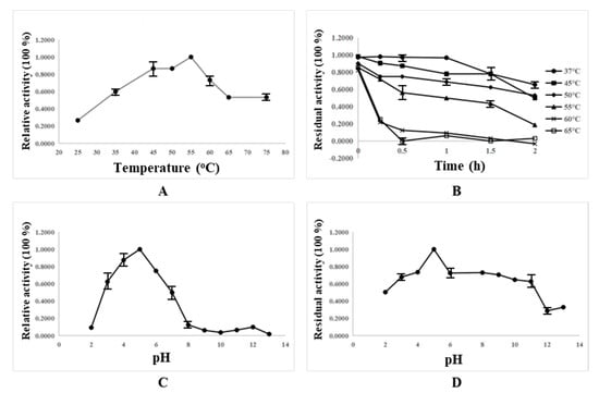 Temperature optima (A), thermostability (B), pH optima (C) and pH stability (D) of the amylases produced by Aspergillus flavus 9261. (A): standard activity assay was performed at different temperatures in the range of 25–75 °C. The reaction mixtures were kept at each temperature for 5 min before starch and crude enzyme solution were added to initiate the reaction. And activity measure at standard condition (pH 5.5, 25 °C) was taken as 100%. (B): the crude enzyme solution was incubated at different temperatures (37, 45, 50, 55, 60 and 65 °C) for given times, and the residual activity was measured by standard activity assay. The activity of the enzyme without incubation at the given temperature was defined as 100%. (C): standard activity assay was performed at different pH values of 2–11. The reaction mixtures were kept at each pH for 5 min before starch and crude enzyme solution were added to initiate the reaction. And activity measure at standard condition (pH 5.5, 25 °C) was taken as 100%. (D): pH stability was recognized according to testing variant gradient buffer values ranging from pH = 2 to pH =13 (for 30 min) at room temperature. Residual activities were examined following the standard conditions. Experiments were performed in triplicate, and the average values were shown as final results.