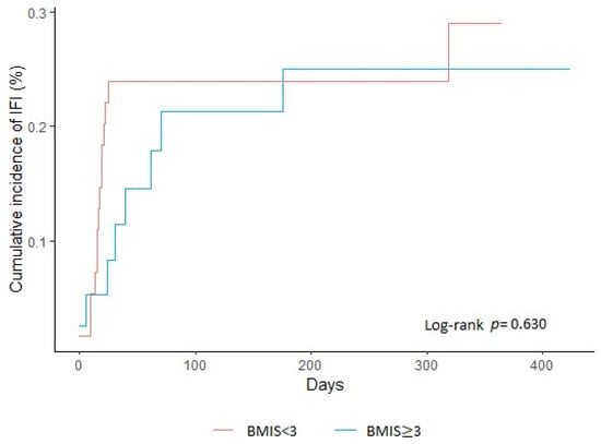For descriptive statistics, we used mean (SD) for normally distributed continuous variables, median (25–75th percentile) for non-normally distributed continuous variables, and absolute (N) and relative (%) frequencies for categorical variables. The Kaplan–Meier curves for IFI development among patients with BMIS < 3 or ≥ 3 were produced. Modeling risk factors that were independently associated with the development of IFI within one year were found by using univariate and multivariable logistic regression analyses for continuous variables and exact logistic regression for categorical variables. Multivariate logistic regression was also performed to investigate the association of increased baseline BMIS with the development of IFI during the follow-up period, adjusted for known risk factors for IFIs, such as neutropenia (or profound neutropenia alternatively), corticosteroid use, diabetes mellitus, malnutrition, and baseline levels of serum iron and serum ferritin. Although results from univariate analysis did not identify any independent risk factors for IFI development, we proceeded to a multivariate analysis, as it is possible, although uncommon, for an association to become significant only after considering all variables []. We applied two sensitivity analyses, excluding the patients with MDS in the first and excluding the patients with invasive candidiasis in the second, and applied the same models. Odds ratios (ORs) and 95% confidence intervals (95% CIs) were reported, and the level of statistical significance was set to 0.05. All analyses were performed with Stata 14 software (Stata Corp., College Station, TX, USA).