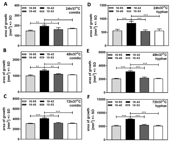 Af293 strains, naturally infected with AfuPmV-1 (18–95, 10–53), virus-free Af293 (18–42), or 18–42 re-infected with AfuPmV-1 (19–40), were used in the form of conidia (Figure 2A–C), or in the form of hyphae (Figure 2D–F). Fungal growth on SDA plates was compared at 37 °C (normal human body temperature) over 72 h, and colony diameters on agar at each time point were used to calculate areas of growth [mm2]. Our results show that the growth of all strains increased over time, whether starting from conidia (Figure 2A–C), or from hyphae (Figure 2D–F). When growth started from hyphae, areas at each timepoint were larger (compare Figure 2A–C to Figure 2D–F). Starting from conidia or from hyphae, the virus free strain 18–42 grew better than any infected strain at each timepoint (Figure 2).