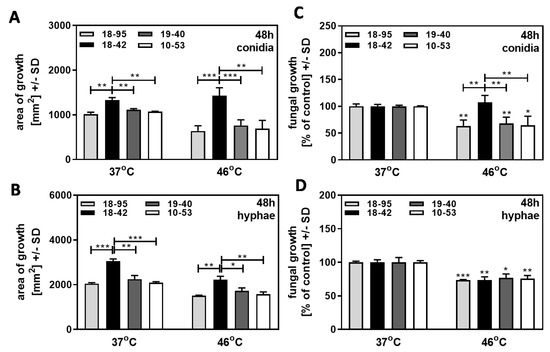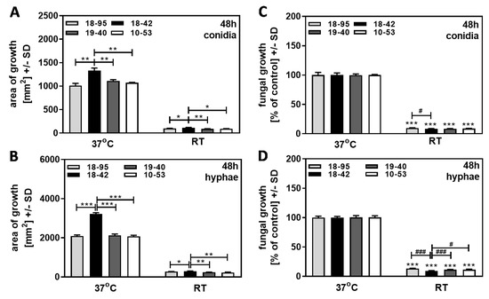 Sterile paper discs were placed on 10 cm agar plates (one disk per plate) and inoculated with 10 µL of A. fumigatus suspensions in RPMI (104 to 107 conidia/mL, as detailed in the Results and Figure Legends). Colony diameters were measured after incubation at temperatures ranging from room temperature (22 °C) to 46 °C for 24 to 96 h, as detailed in the Results and Figure Legends. Areas of fungal growth were calculated using the formula area = r (radius)2 × π and are provided in mm2. Fungal growth on non-supplemented SDA or RPMI agar plates at 37 °C was regarded as 100%. Growth of each strain in the presence of treatment was normalized to that.
