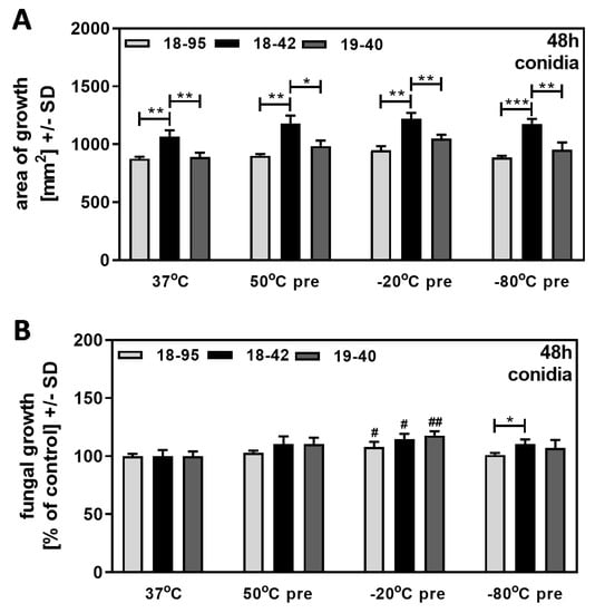 We pre-treated conidia suspensions of 107 conidia/mL by heating to 50 °C for 30 min or by freezing in RPMI medium at −20 °C or −80 °C for 24 h. All suspensions were allowed to equilibrate to room temperature before evaluating growth on SDA plates at 37 °C after 48 h of incubation. Our results show that treatment did not affect the ability of virus-free Af293 (18–42) to grow better than both infected strains (18–95 and 19–40) (Figure 5A). When growth of pretreated fungus was normalized to growth at 37 °C, regarded as 100% for each strain, 18–42 did not show a growth advantage over both infected strains at any condition (Figure 5B).