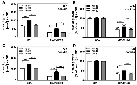 When comparing Af293 strains either naturally infected with AfuPmV-1 (18–95), virus-free (18–42), or virus-free but re-infected with AfuPmV-1 (19–40), we found that after 48 h of incubation, colonies of 18–42, started from conidia, on SDA plates and on SDA plates containing CR [400 µg/mL] grew better than both infected strains (Figure 6A). When growth was normalized for each strain’s growth on SDA = 100%, it emphasized that 18–42 tolerated CR significantly better than both infected strains (Figure 6B). Results before (Figure 6C) and after normalization (Figure 6D) were even clearer after 72 h of incubation, and we observed in multiple experiments that CR effects grew stronger after longer incubation (compare Figure 6B to Figure 6D).
