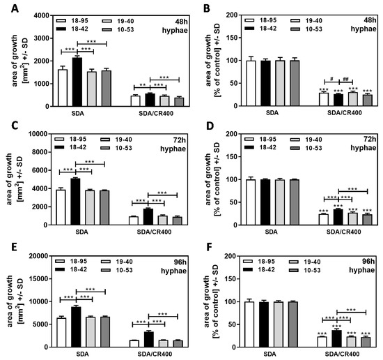 When the same experiment was performed with cultures that started from hyphae, we found that, again, the virus-free strain 18–42 had a growth advantage over all infected strains at 48, 72, and 96 h (Figure 7A,C,E). After normalization to each strain’s growth on SDA = 100% (Figure 7B,D,F), higher resistance of 18–42 to CR was observed, starting at 72 h (Figure 7D) and becoming more pronounced at 96 h (Figure 7F). Interestingly, at 48 h, no increased resistance of hyphae-derived 18–42 cultures to CR was observed (Figure 7B), whereas conidia-derived 18–42 cultures were more resistant than all infected strains at 48 h (Figure 6B).