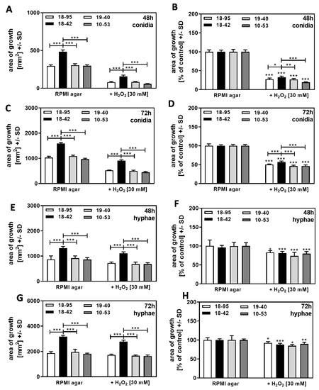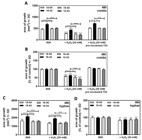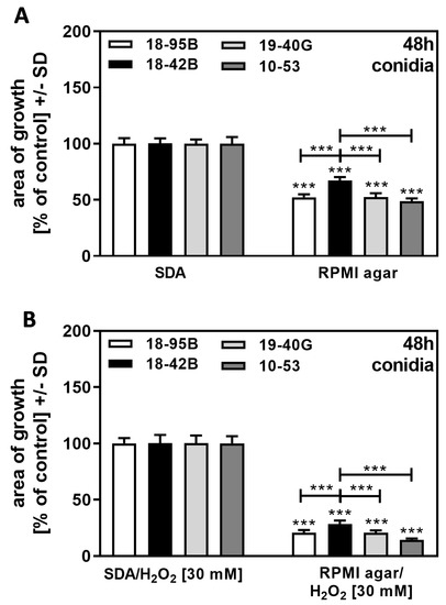 When SDA + H2O2 agar were pre-incubated at 37 °C for 72 h before conidia were added, no growth inhibition (Figure 8A, right and left quartets), and no growth advantage of 18–42 over infected strains (Figure 8B, right and left quartets) was observed, indicating that H2O2 in plates loses activity over time.