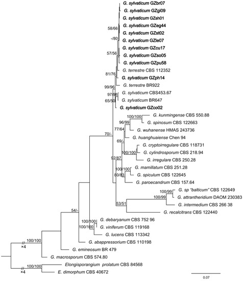 Eleven suspected isolates from various plants were identified using molecular and morphological methods. According to the constructed phylogenetic tree, there was no difference in the clustering distance between the isolates and G. sylvaticum or G. terrestre; furthermore, some sequence differences were found between them, indicating that these pathogens are likely to have relatively rich genetic diversity. Our isolates were eventually identified as G. sylvaticum mainly based on heterothallic and morphological characteristics. Globisporangium terrestre was first reported by Paul (2002), and the ITS sequence was deposited in GenBank (accession number AY039714) [37]. However, we further “Blast” this sequence and found that it is very different from the now known G. terrestre CBS112352 (HQ643857). Robideau et al. (2011) showed that the ITS sequence could not, while cox1 could, distinguish G. terrestre from G. sylvaticum in molecular systematics, but both remained in the same cluster [32]. In addition, G. terrestre is considered to be homothallic, in contrast to G. sylvaticum, but the sexual structures produced by both are similar. Therefore, all strains of these species, including G. sylvaticum isolated from Guizhou, demonstrated the need for further taxonomic study.
