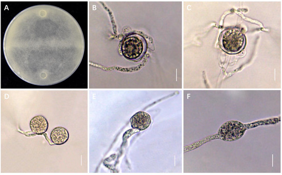Globisporangium sylvaticum is heterothallic; therefore, two putative isolates with opposite mating types were incubated in the V8A medium for confrontation culture. The colony and sexual and asexual structures were observed under a microscope after 1–2 weeks of culture at 25 °C in the dark. A minimum of 20 measurements were randomly obtained for each structure using a light microscope. The isolates were morphologically identified based on the diagnostic keys in the “Monograph of the genus Pythium” edited by van der Plaats-Niterink (1981) [29].