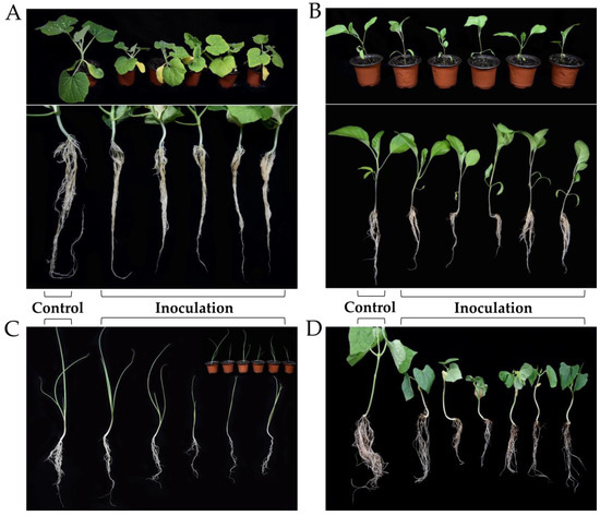Pathogenicity test results of Globisporangium sylvaticum infection of pumpkin (A), eggplant (B), shallot (C), and green bean (D).