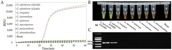 Serial dilutions of G. sylvaticum (GZst02) genomic DNA were used to evaluate the detection limit of the LAMP method using the selected primer set at the optimal temperature. The sensitivity of the LAMP primers was 1 pg/μL based on real-time fluorescence intensity and SYBR Green I dye analysis, as illustrated in Figure 5A,B. The same dilutions were used for PCR, demonstrating a sensitivity of 10 pg/μL (Figure 5C).