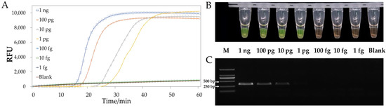 Sensitivity of the LAMP method. (A) LAMP fluorescent dye; (B) SYBR Green I; (C) PCR of serially diluted Globisporangium sylvaticum genomic DNA from 1 ng/μL to 1 fg/μL.