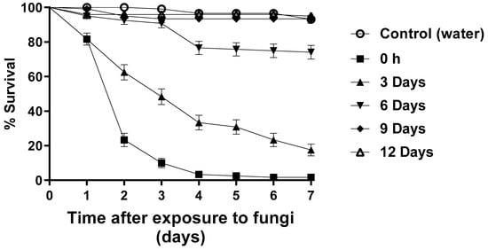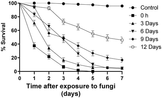 - Falvo, M.L.; Pereira-Junior, R.A.; Rodrigues, J.; Lastra, C.C.L.; García, J.J.; Fernandes, E.K.K.; Luz, C. UV-B radiation reduces in vitro germination of Metarhizium anisopliae s.l. but does not affect virulence in fungus-treated Aedes aegypti adults and development on dead mosquitoes. J. Appl. Microbiol. 2016, 121, 1710–1717. [Google Scholar] [CrossRef] [PubMed]