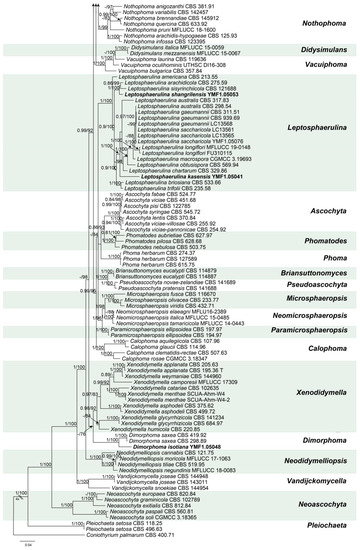 - Chen, Q.; Zhang, K.; Zhang, G.; Cai, L. A polyphasic approach to characterise two novel species of Phoma (Didymellaceae) from China. Phytotaxa 2015, 197, 267–281. [Google Scholar] [CrossRef]