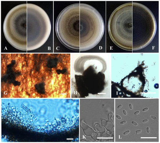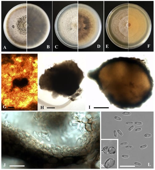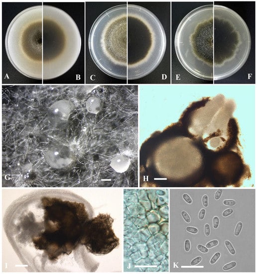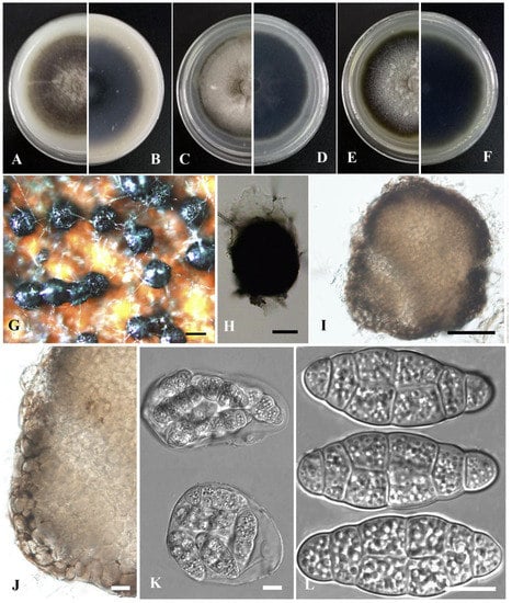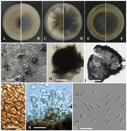 - Liang, J.M.; Li, G.S.; Hou, L.W.; Zhao, M.Q.; Cai, L. Leptosphaerulina species isolated from golf turfgrass in China, with description of L. Macrospora, sp. nov. Mycologia 2021, 113, 1–12. [Google Scholar] [CrossRef]