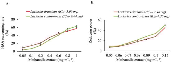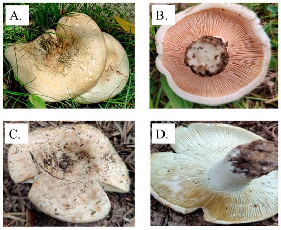 Species 1 was identified as Lactarius drassinus (Figure 1A,B), and species 2 as Lactarius controversus (Figure 1C,D), according to their macromorphological features and responses to different chemical tests, confirmed according to Verma et al. [46] and Pekşen et al. [41]. Furthermore, molecular identification results showed sequence similarity (≥98%) against the reference sequences from GenBank and were confirmed as L. drassinus and L. controversus. Subsequently, FASTA sequences were uploaded on NCBI, and the accession numbers are OM680959 and OM680932, respectively. The phylogenetic trees were constructed using Mega software version 11.0.10 [69] to confirm the evolutionary relationship amongst the Lactarius spp. (Supplementary Material S2).