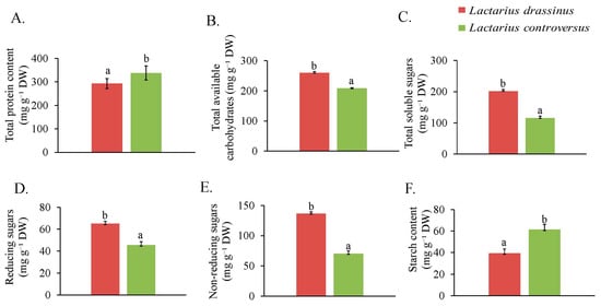 Concentration of total protein content (A), total available carbohydrates (B), total soluble sugars (C), reducing sugars (D), non-reducing sugars (E), and starch content (F) in L. drassinus and L. controversus. Values represent mean ± SD (n = 3). Different letters within a row represent significant difference at p ≤ 0.05, derived from Student’s t-test.