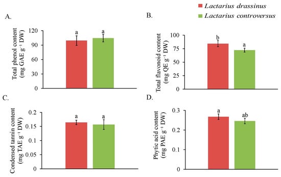 Content of antioxidants: total phenol (A) and total flavonoid (B), and concentration of antinutrients: condensed tannins (C) and phytic acid (D) in L. drassinus, and L. controversus. Values represent mean ± SD (n = 3). Different letters within a row represent significant difference at p ≤ 0.05, derived from Student’s t-test.