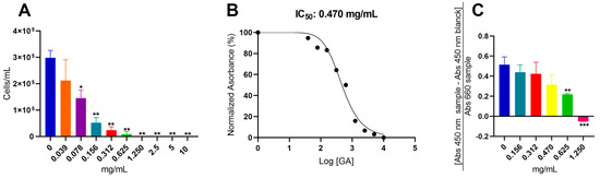 Influence of GA on cell proliferation and viability of C. neoformans. (A) GA microdilution assay from concentrations of 10 mg/mL to 0.03 mg/mL, (B) determination of IC50 of GA in C. neoformans, and (C) cell viability of C. neoformans in different concentrations of GA. Statistical treatment using the Student’s t-test * p-values < 0.05, ** p-values < 0.01. *** p-values < 0.001.
