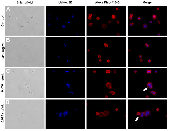 After the different experimental conditions, aliquots containing 1 mL of each culture were centrifuged at 6708× g for 5 min and the cells were washed twice with PBS (pH 7.2 ± 0.2 at 25 °C) to remove the drugs present in the medium. After these procedures, cells were fixed with 4% paraformaldehyde (Sigma Aldrich, St. Louis, MO, USA) in PBS for 20 min. Subsequently, the cells were fixed, and the yeasts were washed twice in PBS and incubated with 1% albumin of bovine serum (BSA) [W/V] (Sigma Aldrich, St. Louis, Missouri, USA) in PBS (PBS-BSA) for 1 h at room temperature. Cells were washed again and incubated for 1 h at room temperature in the presence of the monoclonal antibody (mAb) 18B7 (10 μg/mL), and a mouse IgG1 with affinity for GXM of different cryptococcal serotypes [41,42]. Subsequently, the cells were centrifuged at 6708× g for 10 min, washed twice with PBS, and incubated for 10 min at room temperature with the cell wall dye Uvitex 2B (Polyscience Inc, Warrington, PA, USA) at a 1:1000 dilution in PBS [V:V]. Uvitex 2B binds to chitin (polymer of N-acetyl-D-Glucosamine) present in fungal cell walls. After incubation with the dye, the yeasts were washed four times with PBS to completely remove the unbound dye residue. Finally, cells were incubated with 10 μL/mL (1:100 in PBS) of the antibody secondary anti-mouse IgG Alexa® 546 (ThermoFisher, Waltham, MA, USA) for 60 min at 37 °C. At the end of the incubation, the cells were centrifuged and washed three times with PBS at 6708× g for 10 min. A smooth blade (26 × 76 mm) was mounted by applying 10 µL of the processed cells onto it, which was then covered with a 20 × 20 mm cover slip from the manufacturer Waldemar Knittel Glasbearbeitungs GmbH (Varrentrappstr, Braunschweig, Germany). The resulting slide was observed using an Axio Observer fluorescence optical microscope (Carl Zeiss Microscopy GmbH, Jena, Germany).