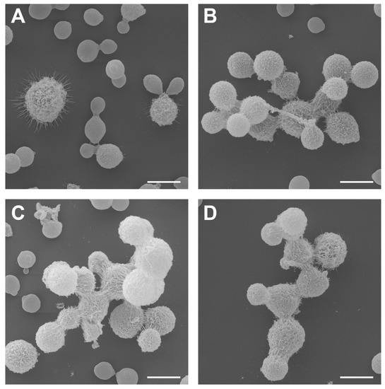 By utilizing scanning electron microscopy, it was possible to analyze the aggregate cells of C. neoformans in the studied concentrations of glatiramer acetate. Reinforcing what had already been observed in previous microscopic analyses, all the micrographs were obtained from the conditions in which GA was present, as shown in the following: 0.312 mg/mL (Figure 4B); 0.470 mg/mL (Figure 4C); and 0.625 mg/mL (Figure 4D), where there was a marked cellular aggregation involving the formation of buds and the production of structures that can lead to biofilm formation. The cellular changes described were highlighted in relation to control fungal cell growth (Figure 4A), which showed cells more separated from each other and with natural processes of sprouts.