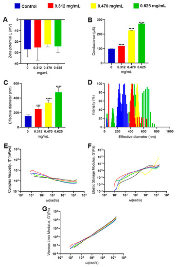 Analysis of physicochemical properties, size, and viscoelasticity of PS by C. neoformans in various concentrations of glatiramer acetate (GA). The control group was represented in blue, which did not receive any drug. The experimental groups were treated with varying concentrations of GA: red for 0.312 mg/mL, yellow for 0.470 mg/mL, and green for 0.625 mg/mL. (A) measurement of the Zeta potential, (B) measurement of conductance (µS), (C) effective diameter, (D) polydispersion of the size of PS, (E) measurement of the viscous complex Ƞ*(mPa•s), (F) measurement of the elastic modulus G’(Pa), and (G) viscous modulus G”(Pa) *** p-value < 0.001. **** p-value < 0.0001. Statistical treatment using the Student’s t-test.
