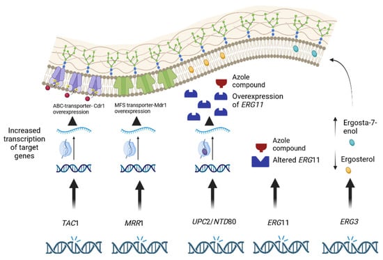 In the case of C. albicans the three major efflux pumps mentioned above detected in azole-resistant clinical isolates are encoded by corresponding genes CaCDR1, CaCDR2 and CaMDR1. The transcription factor CaTac1p regulates the expression of the first two efflux pump genes, while CaMrr1p, another transcription factor, controls the expression of the last one mentioned. In their corresponding genes, CaTAC1 and MRR1 authors found several gain-of-function mutations leading to increased levels of expression of the three related efflux pumps [59,60,61,62].