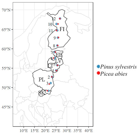 The map of central and northern Europe showing the distribution of Pinus sylvestris and Picea abies sampling sites situated along ca. 2200 km-long latitudinal gradient. Capital letters indicate the country code as follows: SK—Slovakia, PL—Poland, LT—Lithuania, LV—Latvia, EE—Estonia, and FI—Finland. Study sites are numbered as in Table 1.