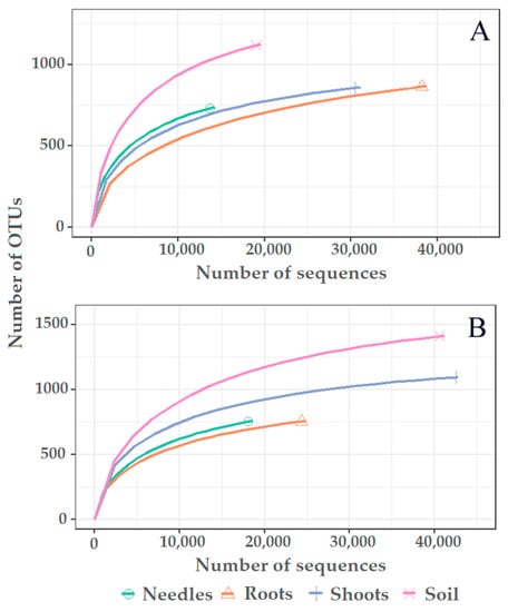 Rarefaction curves showing the relationship between the cumulative number of fungal OTUs and the number of fungal sequences from different substrates (needles, roots, shoots, and the soil) of Pinus sylvestris (A) and Picea abies (B).